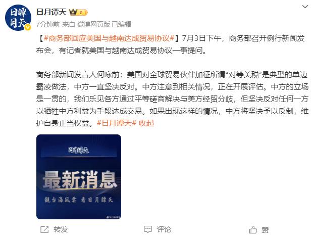 7月3日下午牛豆网,商务部召开例行新闻发布会,有记者就美国与越南达成贸易协议一事提问。
