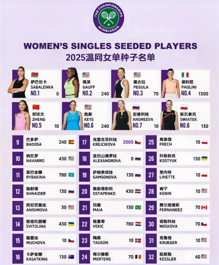 (2)高芙、(3)佩古拉、(4)鲍里妮、(5)郑钦文、(9)巴多萨、(12)施耐德、(15)穆霍娃、(20)奥斯塔彭科、(21)玛雅、(22)维基奇、(25)弗雷希、(26)科斯狄克、(27)里内特、(29)费尔南德斯、(31)克鲁格、(32)凯斯勒中财所