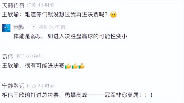 现在,温网冷门不断,也让国内球迷认为王欣瑜也有机会晋级决赛,当然比赛要一场场赢下来才行。